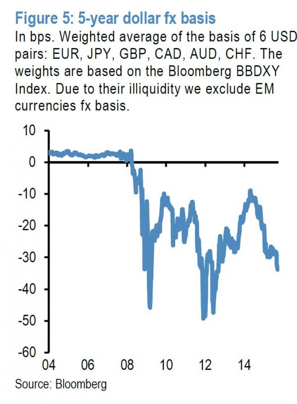 Submitted by�Tyler Durden�on 10/03/2015 Global Dollar Funding Shortage Intesifies To Worst Level Since 2012The last time we observed one of our long-standing favorite topics (first�discussed in early 2009), namely the global USD-shortage which manifests itself in times of stress when the USD surges against all foreign currencies and forces even the BIS and IMF to notice,�was in March of this year, when we explained that "unlike the last time, when the global USD funding shortage was entirely the doing of commercial banks, this time it is the central banks' own actions that have led to this global currency funding mismatch - a mismatch that unlike 2008, and 2011, can not be simply resolved by further central bank intervention which happen to be precisely the reason for the mismatch in the first place." Furthermore JPM conveniently noted that "given the absence of a banking crisis currently, what is causing negative basis? The answer is monetary policy divergence.�The ECB’s and BoJ’s QE coupled with a chorus of rate cuts across DM and EM central banks has created an imbalance between supply and demand across funding markets.�Funding conditions have become a lot easier outside the US with QE-driven liquidity injections and rate cuts raising the supply of euro and other currency funding vs. dollar funding. This divergence manifested itself as one-sided order flow in cross currency swap markets causing a decline in the basis." To which we rhetorically added: "who would have ever thought that a stingy Fed could be sowing the seeds of the next financial crisis (don't answer that rhetorical question)." All this was happening when the market was relentlessly soaring to all time highs, completely oblivious of this dramatic dollar shortage, which just a few months later would manifest itself quite violently first in the Chinese devaluation and sale of Treasurys, and then in the unprecedented capital outflow from emerging markets as the great petrodollar trade - just as we warned in November of 2014 - went into reverse. In fact, there are very few now who�do not�admit the Fed is responsible for both the current cycle of soaring volatility, or what may be a market crash (as DB just warned) should the Fed not take measures to stimulate "inflation expectations" (read: more easing). In any event, since March we have received numerous requests for follow-up of where said funding shortage is now. So here are the latest observations on the current level of the global dollar funding shortage as measured by the Dollar fx basis, courtesy of JPM: