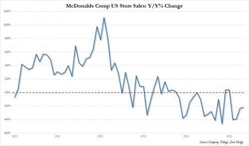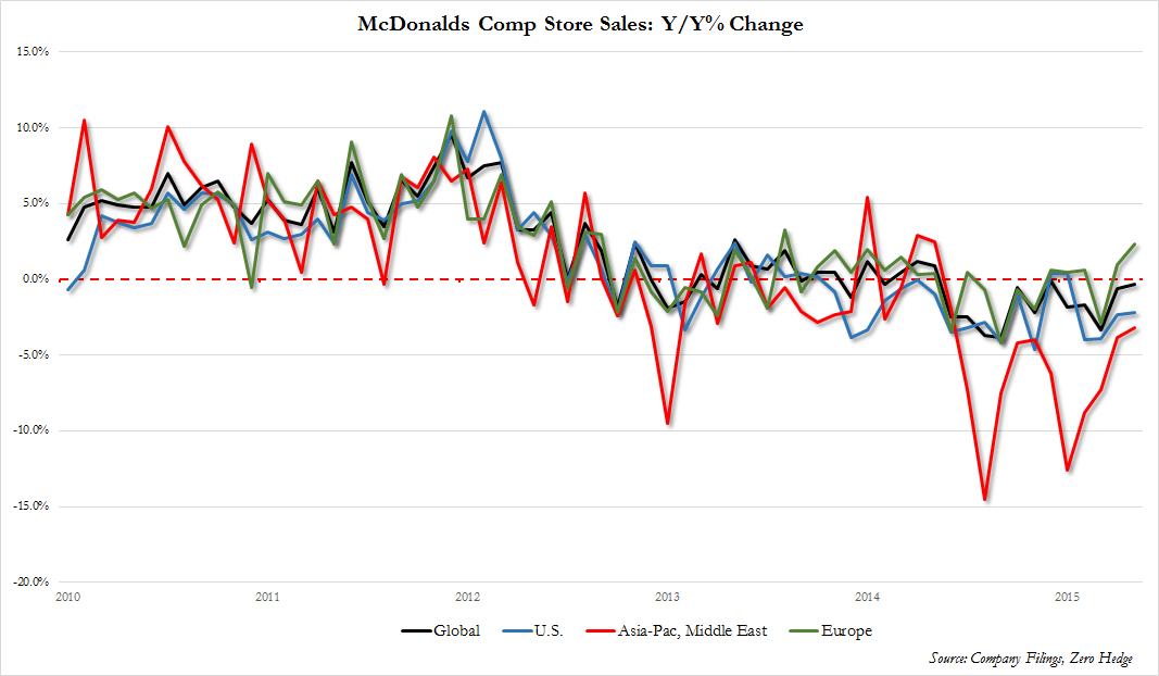 RETAIL - Why McDonalds Is Ending Monthly Sales Reports Why McDonalds Is Ending Monthly Sales Reports: Global Sales Drop For 12 Consecutive Months 06-08-15 ZH Ten days ago we reported with much amusement that the "turnaround story" that is McDonalds has decided to pull the oldest trick in the collapsing business book, and would stop reporting its monthly comparable sales starting with the month of June. Moments ago MCD reported its May comp store sales which confirmed what we cynically noted is the reason for the data halt, namely that no matter what it does, MCD simply can not "turnaround" its foundering business, and after a drop of -0.6% in April, May global comp sales dropped once again, this time by -0.3%. This was the 12th consecutive month of global comparable store declines. Next month will be the 13th. There won't be a 14th. The good news for Europe is that with a jump of 2.3% in May comp store sales, the European recovery is clearly taking hold and the tens of millions of unemployed youths can finally afford a 99 cent meal. But perhaps the biggest irony is that the drop was driven not by Europe or Asia, where one would expect the strong dollar to be wreaking havoc on US-denominated sales, but in the US, where same store sales dropped -2.2%, more than the -1.7% expected. We wonder if the decline in USD-denominated US sales will also gain be blamed on the strength of the US currency? Finally, as we have said all along, it really is time for MCD's new boss Steve Easterbrook to start wearing many more pieces of flair or he will join his predecessor Don Thompson in "retiring" prematurely any month now.