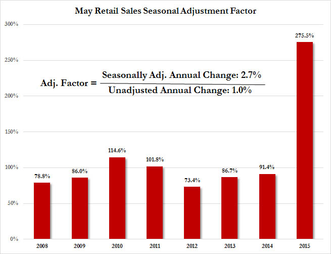 RETAIL - "Double" Seasonal Adjustments The Curious Case Of "Strong" Retail Sales: Is The US Already Applying "Double" Seasonal Adjustments 06-12-15 ZH There was some confusion why following yesterday's stronger than expected retail sales, which broke a 4-month series of disappointing data and which according to most economists were good enough to bring forward the Fed's first rate hike in a trader generation, bond yields tumbled. Well, in the aftermath of the whole "double seasonal-adjustment" travesty, in which even the BEA admitted any bad economic data (read Q1 GDP) will be "massaged" enough until it becomes good under the "scientific" pretext of "residual seasonality", and following the suggestion of Dynamika Capital's Alexander Giryavets, we decided to take a look at not seasonally adjusted retail sales. We found something interesting. The thing about retail sales is that while they are supposed to smooth out month-to-month changes in any given data series, they should be virtually identical on a annual, year-over-year basis. After all the same "seasonal" adjustment that was applicable this May, was applicable last May, the May before it, and so on, unless of course, there was some massive, climatic or otherwise shift to the underlying reality. To the best of our knowledge there wasn't. And indeed, when looking at the annual change in headline retail sales data we find that, as expected, the seasonally-adjusted (blue) and unadjusted (red)retail sales series are almost identical... ... but not quite. If one zooms in on the most recent data, one finds something surprising: a substantial rebound in SA retail sales, which according to the Dept. of Commerce rose 2.7% while unadjusted retail sales rose by just 1.0%,the worst montly print in over two years and hardly inspiring confidence that the economy is strong enough for the Fed to engage in a rate hike. To isolate the problem we decided to look at only the annual (YoY) change in May data. The chart below shows the surprising finding: while every year for the past 4 years the Unadjusted May data was equal to or stronger than the Adjusted retail sales print, in May of 2015 this was reversed, and quite substantially. To show just how much of an outlier May 2015 was compared to May in prior years, here is the seasonal "adjustment ratio" for the month of May for every year from 2008 to 2015, by which we define the ratio of "seasonally adjusted" to "unadjusted" retail sales. Spotting the outlier should be easy enough. So, our question: while we know that the US Department of Truth, err. Commerce, will soon adjust GDP data for all weak quarters higher just so the narrative of a rebounding economy isn't lost when one looks at the actual fact, has this "residual seasonality" adjustment already been applied to retail sales? Because we fail to understand just why the seasonal adjustment to May retail data should be as profound as shown above. Source: (Double?) Seasonally-Adjusted and Unadjusted retail sales |